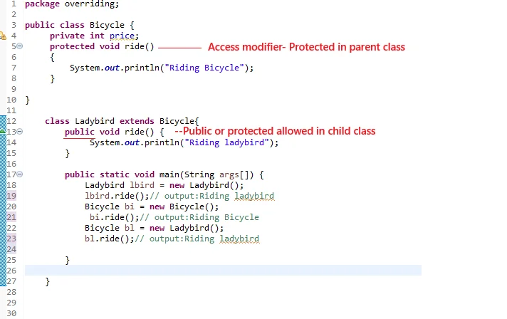 Access Modifier: The access modifier of the overriding method in the subclass must be the same as, or less restrictive than (e.g., protected to public), the access modifier in the superclass.